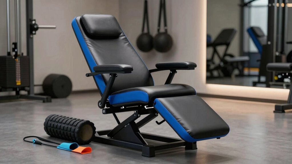 Choosing the right recovery chair hinges considerably on its adjustability and comfort features, as these guarantee a personalized and supportive experience. Adjustable seat height, armrest positions, and backrest angles ensure each athlete can find their ideal fit, boosting comfort during recovery. An ergonomic design supports proper posture, reducing strain and promoting muscle relaxation. Padded surfaces, like thick cushions and face cradles, add extra comfort for long sessions. The ability to customize support with adjustable lumbar or neck pillows helps accommodate individual body needs and preferences. A well-designed chair distributes weight evenly, minimizing pressure points and preventing discomfort during extended recovery periods. Prioritizing these features guarantees a more effective, comfortable recovery process tailored specifically to your body.