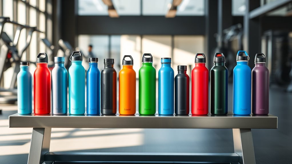 Looking for the best reusable water bottles for your gym sessions? I recommend options like BPA-free Tritan bottles, stainless steel insulated models, and leak-proof designs with easy one-handed operation. Features like carry handles, time markers, and wide-mouth openings make hydration hassle-free. Whether you want lightweight, stylish, or temperature-retaining bottles, there’s something for everyone. Keep exploring to find the perfect fit to stay hydrated and motivated during every workout.