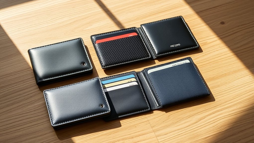 Efficient access to your cards can make a big difference in daily convenience. RFID wallets with quick-access card slots let you grab essential cards fast, without sacrificing security. Features like transparent ID windows make it easy to see and access your identification without removing it. Wallets with pull-out or pop-up mechanisms allow you to access multiple cards seamlessly, saving time and hassle. A well-organized layout with designated slots for frequently used cards helps minimize searching and keeps everything tidy. Compact and slim designs make handling quick and effortless, fitting comfortably into pockets or bags. Prioritizing ease of access guarantees you can quickly retrieve your cards when needed, enhancing both functionality and everyday efficiency.