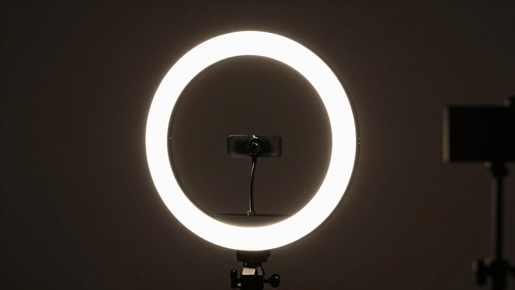Budget considerations play a crucial role in selecting the right ring light for your video needs. With prices ranging from under $20 for basic models to over $200 for professional-grade options, setting a clear budget helps narrow your choices. Cheaper ring lights often lack adjustable features, have smaller sizes, and offer lower color rendering indices, which can impact lighting quality. In contrast, higher-priced options typically provide more brightness levels, better CRI ratings (above 95), and advanced features like adjustable color temperatures and remote controls. Investing a bit more can also mean better build quality, longer durability, and improved light diffusion for professional results. Establishing your budget upfront ensures you compare features effectively, avoiding overspending on unnecessary extras or sacrificing essential lighting quality.