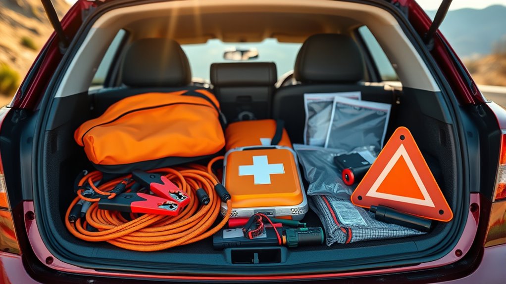 Selecting the right jumper cables is crucial for reliable roadside assistance, and high-quality, heavy-gauge wiring—such as 6 or 8 gauge—is indispensable for effective power transfer. Look for insulated alligator clips with strong serrations and springs to guarantee a secure grip, preventing slipping during use. A well-rounded emergency kit should also include safety tools like a headlamp, gloves, reflective warning triangles, and first aid supplies, helping you stay prepared in various situations. Durability matters, so choose kits with weather-resistant components, such as PVC-insulated jumper cables and waterproof headlamps, to withstand harsh conditions. Additionally, a variety of tools—screwdrivers, pliers, and tire pressure gauges—can make roadside repairs easier and more efficient, providing you with confidence when handling different emergencies.