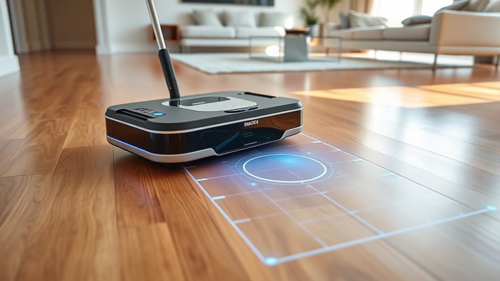 Robot mops handle different floor types by using advanced sensors and adaptive cleaning modes. I’ve seen them switch seamlessly from hardwood to tile or carpet, adjusting their scrubbing power and movement patterns. They detect surface textures and dirt levels, ensuring thorough cleaning without damaging delicate floors. This smart adaptability means I don’t have to manually change settings, making my cleaning routine easier and more efficient every time.