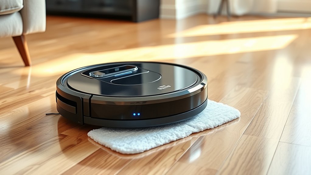 Ever wondered how some robot vacuums flawlessly navigate around furniture and obstacles? It all comes down to advanced sensors like LiDAR, LDS, or optical cameras that create accurate maps of your home. These sensors, combined with SLAM algorithms, allow the robot to plan routes in real time and avoid obstacles effectively. A vacuum with strong navigation skills can detect changes in the environment and adapt quickly, guaranteeing consistent coverage across multiple cleanings. Precise navigation also means fewer missed spots and less redundant cleaning, saving time and battery. Additionally, complete obstacle recognition and fall detection sensors help prevent accidents around stairs or furniture. When choosing a robot vacuum with mop functionality, prioritize these navigation features to ensure thorough, reliable cleaning every time.