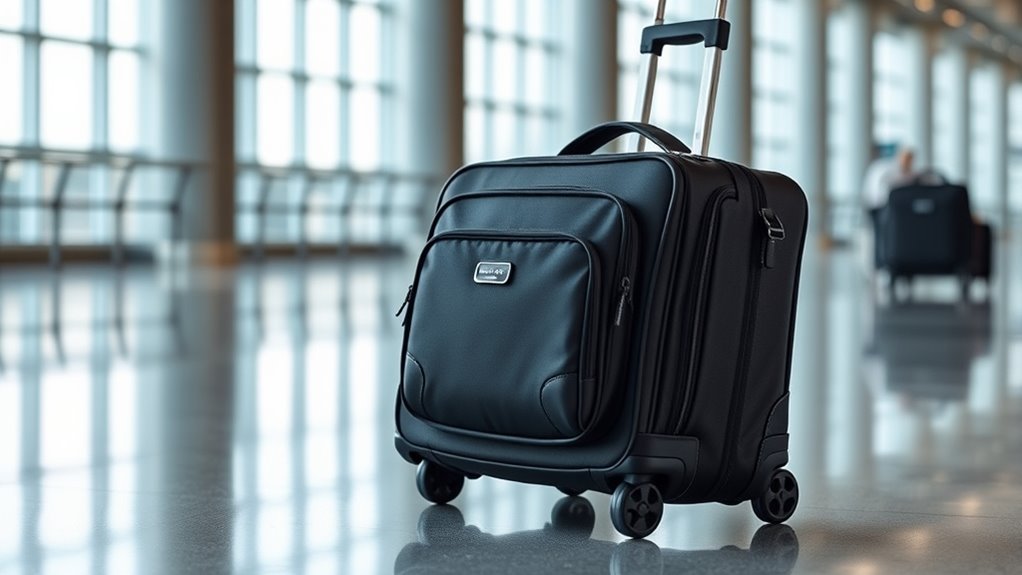 To guarantee my rolling bag meets airline size restrictions, I always check the specific airline’s carry-on dimensions before packing. I measure my bag with a tape to confirm it fits within the allowed limits, usually around 22 x 14 x 9 inches. I also look for bags with clear size labels and consider soft-sided options that can slightly compress. Being prepared helps me avoid surprises at the gate.