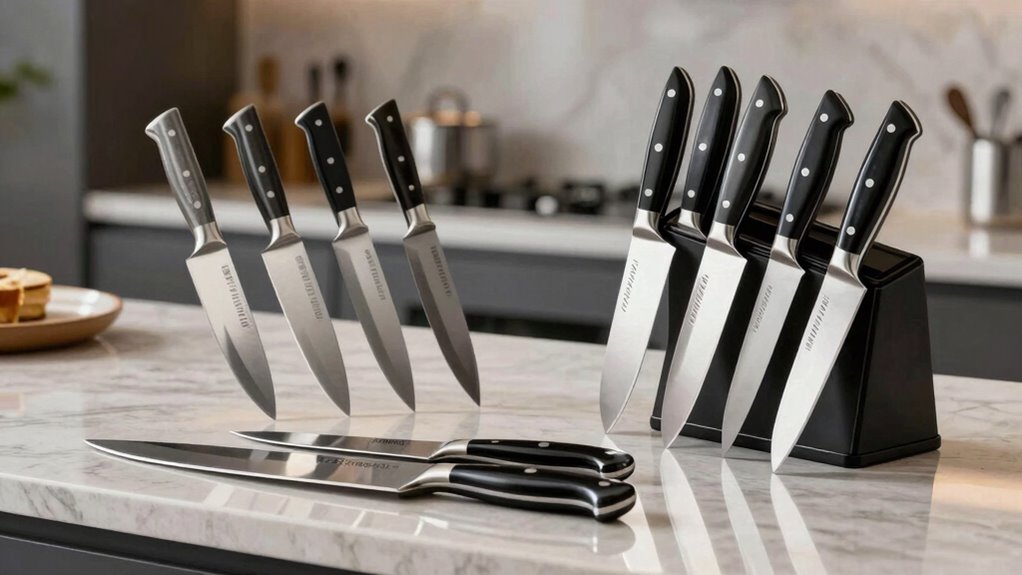 Price and budget are important factors to contemplate when selecting between santoku and chef knife sets. Higher-quality sets made with premium materials like VG10 or Damascus steel tend to cost more because they offer better durability and sharper edges over time. Budget-friendly options usually feature stainless steel blades with lower carbon content, which may require more frequent sharpening but are more affordable upfront. The overall price can also increase with extras like storage cases, sharpening steels, or decorative handles. Sets that include specialized knives or ergonomic handles tend to be pricier but can enhance comfort and functionality. Investing a bit more in a higher-priced set often pays off through improved performance, longer-lasting sharpness, and greater durability, making it a smart long-term choice.