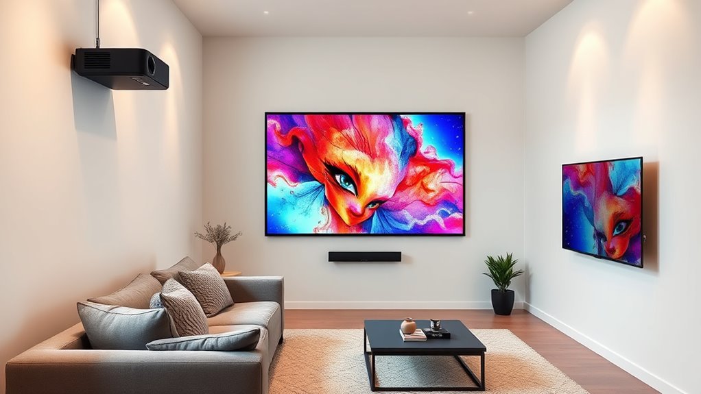 Ever wonder how brightness and contrast impact the clarity of a short-throw projector? Brightness, measured in lumens, determines how well images shine in different lighting conditions. For versatile use, look for at least 3,000 lumens, especially if you’re in a bright room or outdoors. Contrast ratio, like 10,000:1 or higher, enhances image depth and detail, making dark scenes more vivid and engaging. These two factors work together—high lumens can offset ambient light, but without strong contrast, images may look washed out. A lower contrast ratio diminishes visual impact, reducing the sense of depth. So, for the best picture quality under $1000, prioritize projectors with high lumens and contrast ratios, ensuring clear, vibrant images whether in a dim room or a well-lit space.