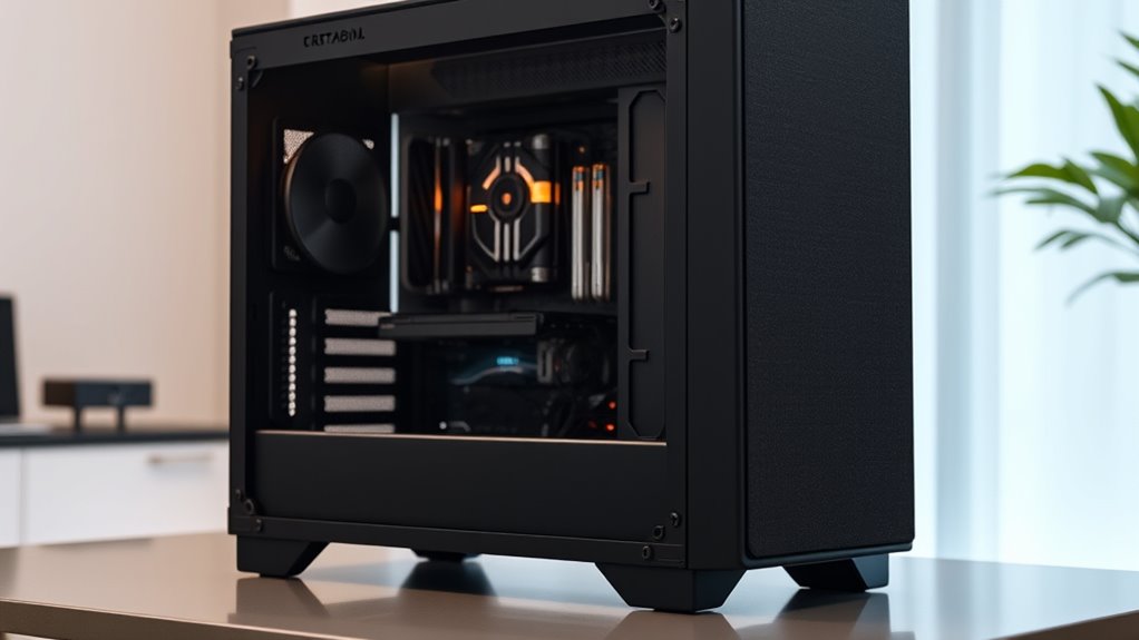 When aiming for a whisper-quiet operation, paying attention to sound damping features is essential. High-density foam and industrial-grade damping mats are key—they absorb vibrations and block noise transmission effectively. Fully insulated panels and soundproofing linings further minimize operational sounds, keeping your build discreet. Sound-absorbing foam on side panels and internal chambers helps dampen airborne noise and vibrations from components. Multi-layer construction, combining soundproofing layers with noise-absorbing materials, boosts overall noise reduction. Additionally, vibration-isolating mounts for fans and other components considerably cut down mechanical noise and resonance. These features work together to create a quieter environment, ensuring your PC runs smoothly without disturbing your workspace or entertainment area. Prioritizing these sound damping elements is vital for achieving a silent, cool build.