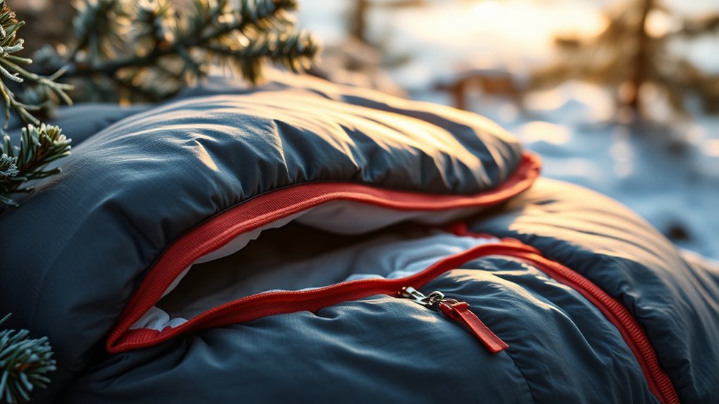 Additional features can greatly enhance a sleeping bag’s insulation and convenience in cold weather conditions. Zipper draft tubes and hood drawstrings are vital; they help trap heat and prevent cold air from seeping in. Some bags include anti-snag zippers or zipper guards to protect against damage and ensure smooth operation. Built-in stash pockets or interior compartments make it easier to access small essentials like headlamps or snacks without digging through your gear. Compatibility features like zip-together zippers enable you to create a double sleeping setup for extra warmth. Waterproof coatings or DWR finishes also add protection against moisture and dampness, which is essential in winter camping. These additional features can greatly improve your comfort and warmth in harsh conditions.