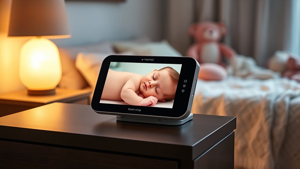 Adding extra safety features to a smart baby monitor with breath tracking can considerably boost peace of mind. Features like cry and cough detection alert me to potential issues without constantly watching the monitor. Temperature and humidity sensors help maintain a comfortable environment, while instant alerts notify me of any abnormalities. Danger zone alerts and motion detection enable quick responses to sudden movements or hazards. Two-way audio and lullabies offer reassurance, making it easier for my baby to settle or feel comforted. Secure data encryption and customizable access controls protect my family’s privacy. Integrated environmental sensors and real-time notifications create a safer, more controlled sleep space. These added safety features give me confidence that I’m proactively safeguarding my little one’s well-being.
