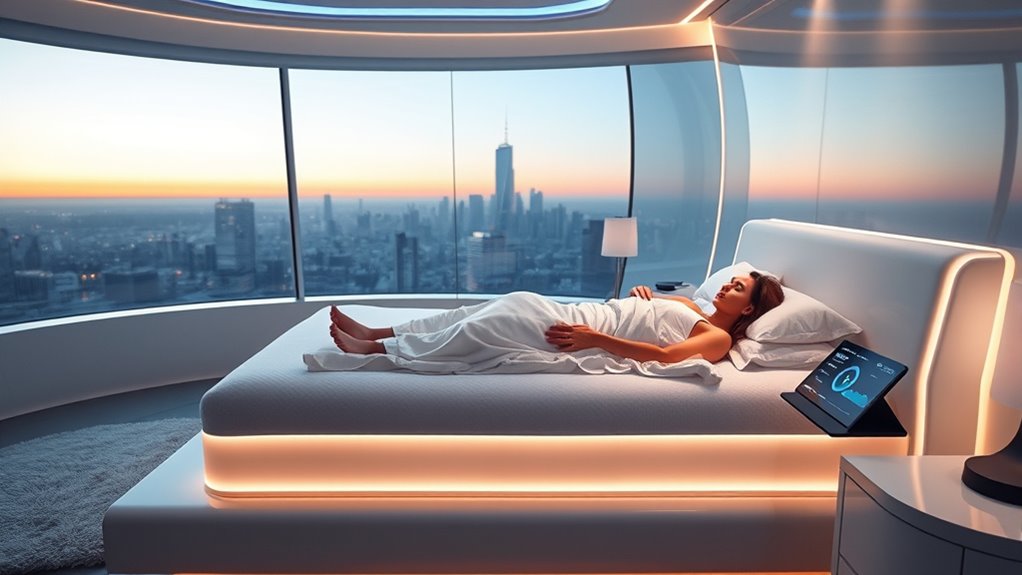 High-tech sleep products include safety features like automatic shut-off if overheating is detected, waterproof barriers to prevent moisture damage, and secure, non-toxic materials to guarantee safe contact with your skin. I appreciate their focus on user safety, giving me peace of mind. These features help protect me from potential hazards, making my sleep environment both smart and safe. You can enjoy your rest knowing your sleep tech prioritizes your well-being.