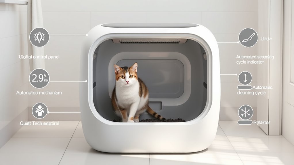 Self-cleaning litter boxes stand out for their advanced automatic systems that eliminate the need for manual scooping, making life easier for busy pet owners. These units feature pull-out waste drawers for simple bag changes and boast XXL capacity, so they can handle multiple cats and last up to four weeks without scooping. Safety sensors prevent accidents during cleaning, stopping the process if a cat is inside. They operate quietly at just 35dB and work with most litter types, ensuring minimal disturbance. Plus, smart controls via an app let you monitor usage and receive alerts, while customizable lighting creates a calming environment for your feline friends.