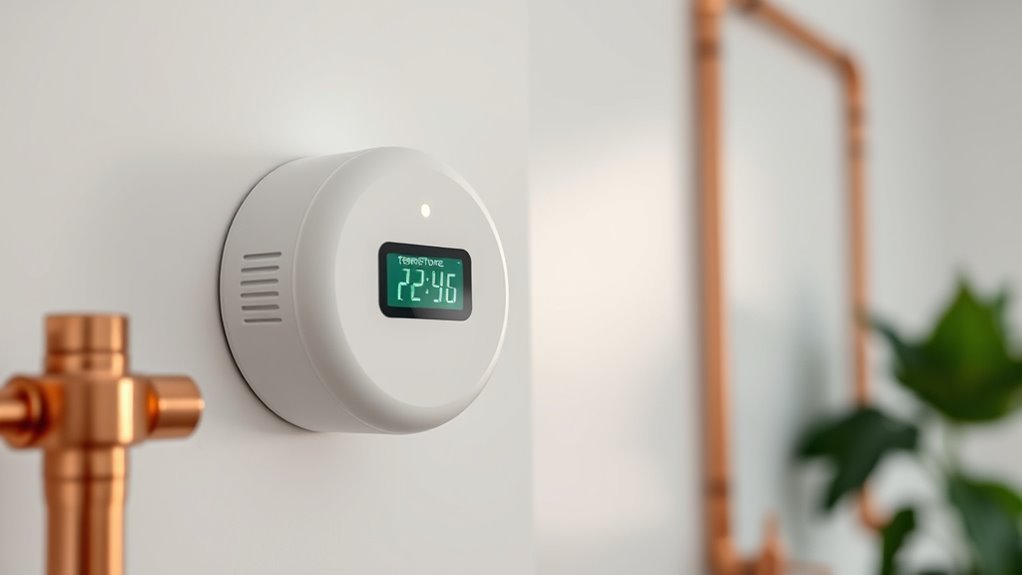 Choosing a smart leak detector with temperature alerts hinges largely on sensor accuracy and sensitivity. Sensors with higher sensitivity can detect even minor leaks or slight temperature drops, allowing for earlier warnings that help prevent damage. Accurate sensors provide precise readings, reducing false alarms caused by environmental noise or sensor drift. The placement and calibration of these sensors are vital; well-placed and properly calibrated sensors improve detection reliability. Advanced technology, like capacitive or conductive detection, often outperforms basic probe-based systems in accuracy. Additionally, regular testing and maintenance are essential to maintain sensor sensitivity and guarantee consistent performance. Investing in a detector with precise, sensitive sensors means you’ll catch issues sooner, giving you peace of mind and better protection for your home.