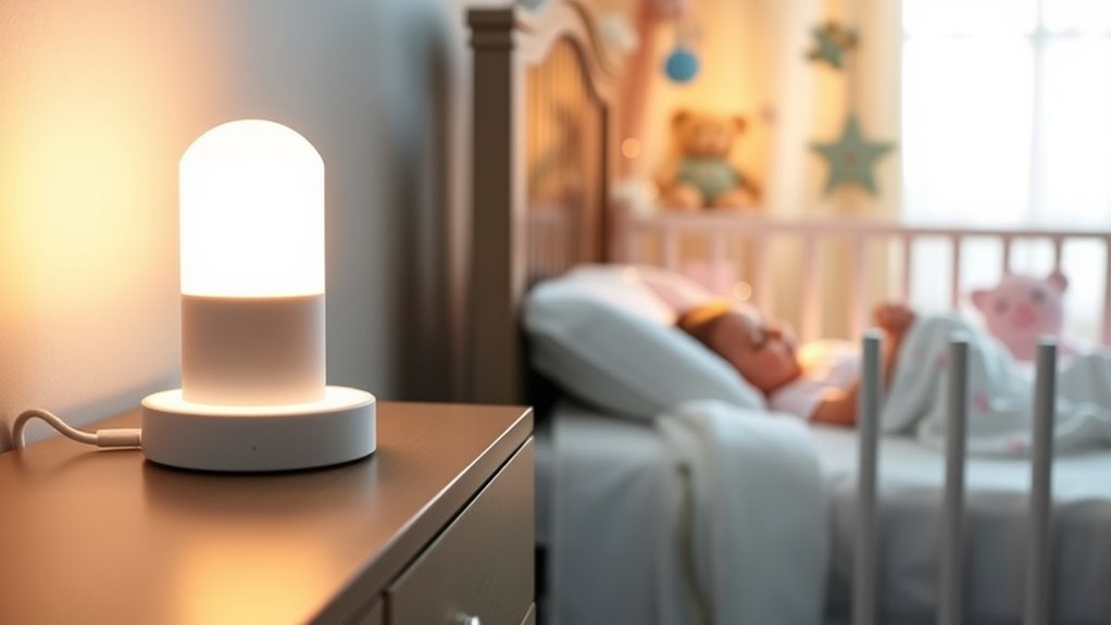 Smart night lights often emit some blue light, but many models are designed to minimize this. I look for lights with adjustable or warmer tones, which are less likely to disrupt sleep. I’ve found that using dim, amber, or red settings helps me sleep better, as these colors don’t interfere with melatonin production. So, if you’re concerned, choose a night light with customizable, warmer options for a more restful night.