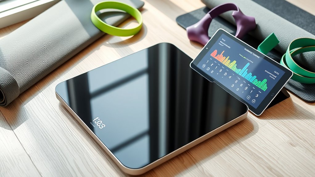 Choosing a smart scale with solid design and build quality guarantees durability, safety, and ease of use. A sturdy tempered glass platform with an anti-slip surface ensures stability and prevents accidents during weigh-ins. It’s essential that the scale’s size and electrode placement accommodate various foot sizes for accurate measurements. High-quality materials like heavy-duty glass and sturdy plastic contribute to the device’s longevity and resistance to damage over time. Precise sensors and consistent calibration are vital for reliable full-body composition readings. Additionally, an ergonomic design with user-friendly features—such as large, easy-to-read displays and surfaces that are simple to clean—enhance overall usability. Investing in a well-built scale means it will serve you reliably as you track your fitness progress.
