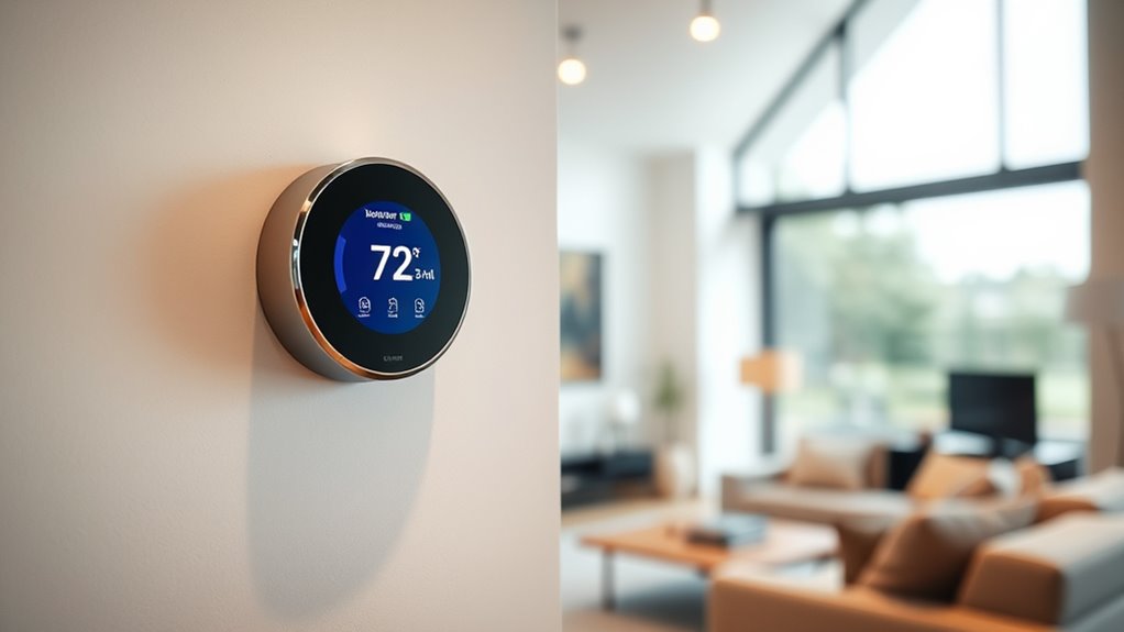 To guarantee your smart thermostat integrates smoothly into your home, it’s essential to take into account its compatibility with popular smart home ecosystems like Amazon Alexa, Google Assistant, Apple HomeKit, or Samsung SmartThings. Compatibility ensures you can control your thermostat hands-free and set up routines that connect with other smart devices. Support for protocols such as Z-Wave, Zigbee, or Matter broadens communication with various hubs and sensors, making your system more versatile. Using dedicated apps allows remote management, scheduling, and automation, boosting convenience and energy savings. Voice control adds a hands-free, seamless experience, while firmware updates and open APIs ensure your thermostat stays current and customizable. These features collectively create a more integrated, intuitive smart home environment.