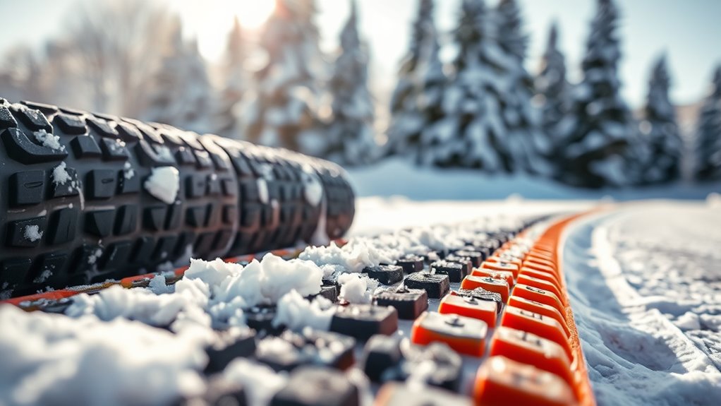 The traction effectiveness of snow mats hinges on their surface design, material quality, and additional features that enhance grip. I look for mats with honeycomb patterns or textured surfaces because they increase tire contact and grip on icy surfaces. The material matters too; high-strength polypropylene or TPR helps generate the necessary friction in snow and ice. Features like steel studs or cleats really make a difference—they dig into snow, ice, or loose terrain for better traction. The size and surface area also matter, as larger mats provide more stable support and reduce tire spin during recovery. Finally, compatibility with different tire types and durability in extreme weather are essential for reliable traction. These factors combined ensure I stay mobile in winter conditions.