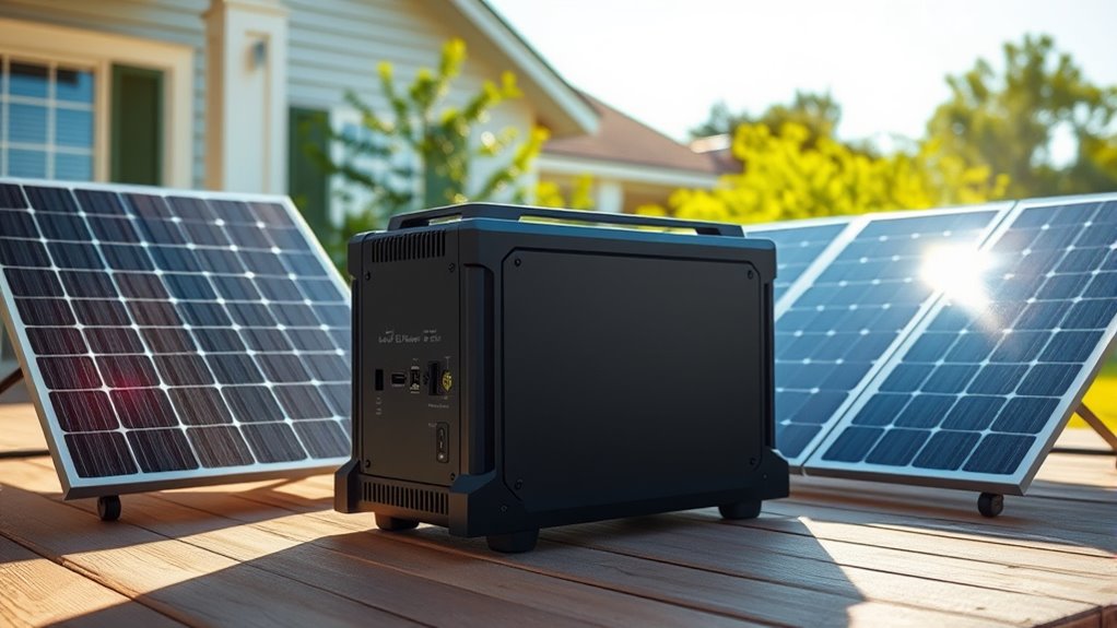 Choosing a solar generator with flexible recharging options guarantees you stay powered in a variety of situations. I look for units that support multiple recharging methods, like AC wall outlets, solar panels, and carports, ensuring I can recharge regardless of circumstances. Fast recharging technology, such as ultra-fast charging, is a game-changer—allowing me to fully recharge in just 1-2 hours, which minimizes downtime. I also prioritize models with MPPT controllers, as they optimize solar energy conversion, especially in low-light conditions. High-wattage solar inputs, over 600W, enable quicker solar recharging, making the generator suitable for emergencies or off-grid use. Additionally, the ability to recharge from multiple sources simultaneously, like solar and AC power, cuts down recharge time and boosts energy resilience.