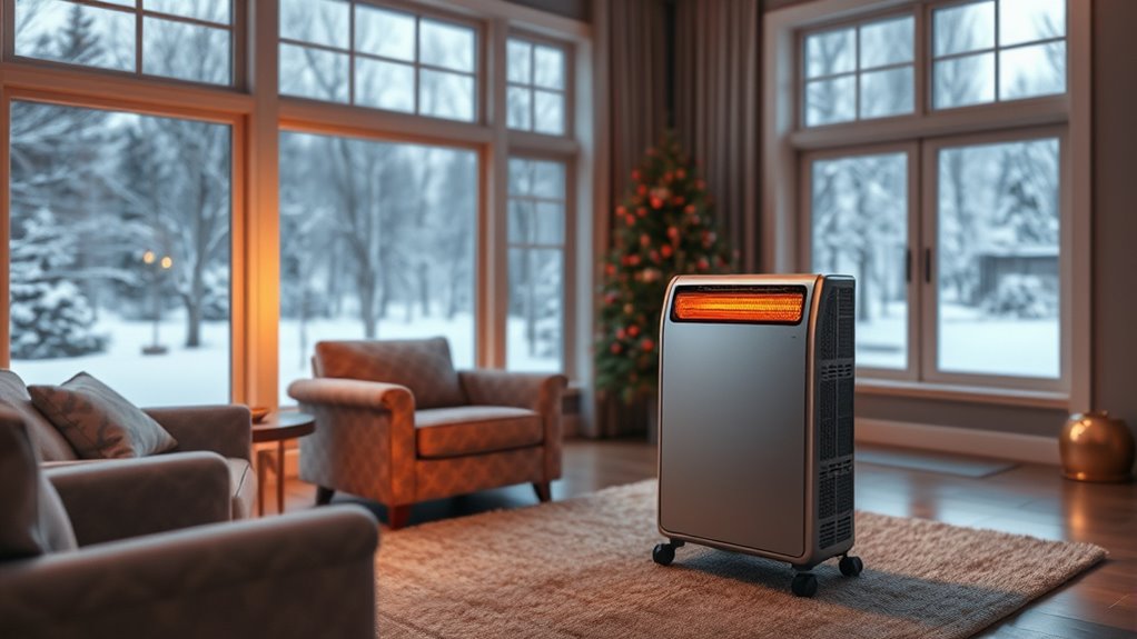 Safety certifications like ETL or UL are essential indicators that a space heater has met rigorous safety standards. These certifications mean the product has undergone thorough testing for fire, electrical, and mechanical safety, giving you peace of mind. Look for heaters with features like tip-over protection, overheat shut-off, and cool-touch exteriors, which are critical for safe operation, especially in large or busy spaces. Flame-retardant materials and reinforced electrical components further enhance safety, reducing the risk of accidents. Always verify that the heater displays proper safety labels and has been tested according to recognized protocols. Choosing a certified heater not only guarantees compliance but also minimizes hazards, making your heating experience safer and more reliable throughout the winter season.