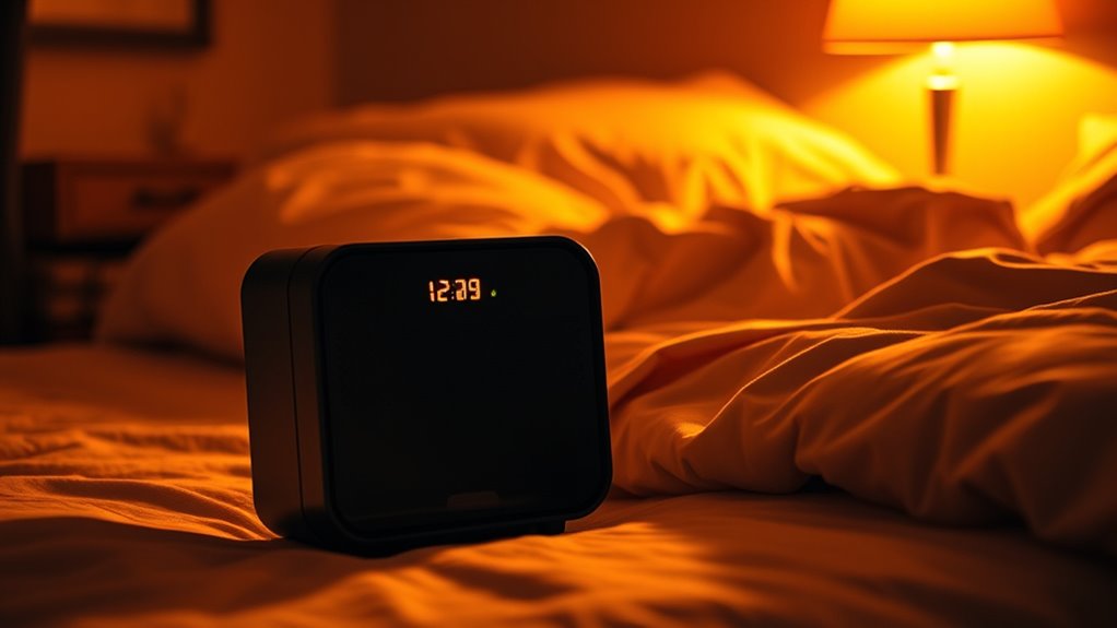 I find that ceramic space heaters are the quietest for bedroom sleep because they operate smoothly and produce minimal noise. I recommend models with a low decibel rating, around 40-50 dB, as they won’t disturb your rest. Personally, I prefer heaters with a fan-only setting for quick warmth and a quiet mode for sleeping. Always check reviews and specifications to guarantee they’re truly quiet before buying.
