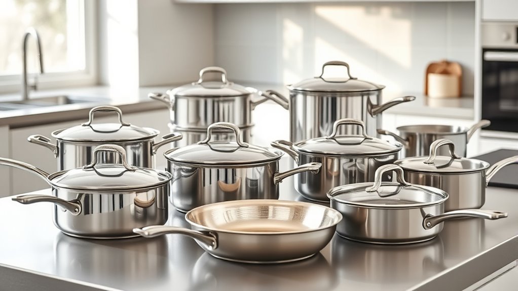 When selecting a stainless steel cookware set, it’s essential to guarantee the overall price against the features and quality offered to ensure you get good value for your money. I recommend comparing sets to see if they include essential pieces like saucepans, skillets, and stockpots, which maximize functionality without extra costs. Durability and material quality are also crucial— investing in a well-made set can save you money long-term by lasting for years. Be mindful of additional costs for lids, utensils, or accessories, as these can add up. Finally, check customer reviews and ratings to gauge satisfaction and verify that the set delivers on its promises without breaking your budget. Finding the right balance ensures you get the best value without sacrificing quality.