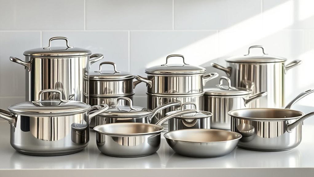 Choosing the right stainless steel cookware set largely depends on its material quality and durability, which determine how well it will perform over time. High-quality stainless steel, like 18/10 or 304 grades, resists corrosion and staining, ensuring longevity. Multi-ply or clad construction, such as tri-ply or five-ply layers, strengthens the set, providing even heating and resistance to warping. Handles that are riveted and made from stainless steel add to durability, preventing loosening or breaking. Proper maintenance, like hand-washing and avoiding abrasive cleaners, can substantially extend its lifespan by preventing discoloration and surface damage. Well-constructed sets resist pitting, staining, and warping, maintaining their appearance and performance through years of regular use, making them a smart investment for any kitchen.
