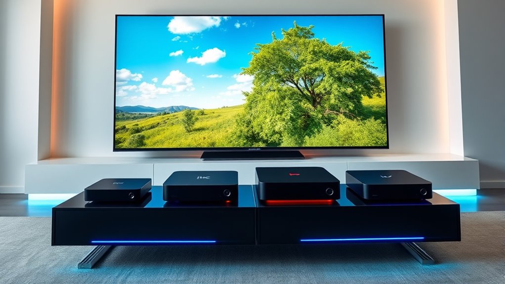 If you’re looking for the best 4K streaming media players of 2025 for stunning picture quality, I recommend the latest options like Roku Ultra, Amazon Fire TV Max, NVIDIA SHIELD, and Xiaomi Mi Box S. These devices support HDR, Dolby Vision, Atmos, and fast HDMI connections to deliver crisp visuals and immersive sound. They also offer user-friendly interfaces, smart home compatibility, and versatile connectivity. Keep exploring, and you’ll discover the perfect device tailored to your entertainment needs.