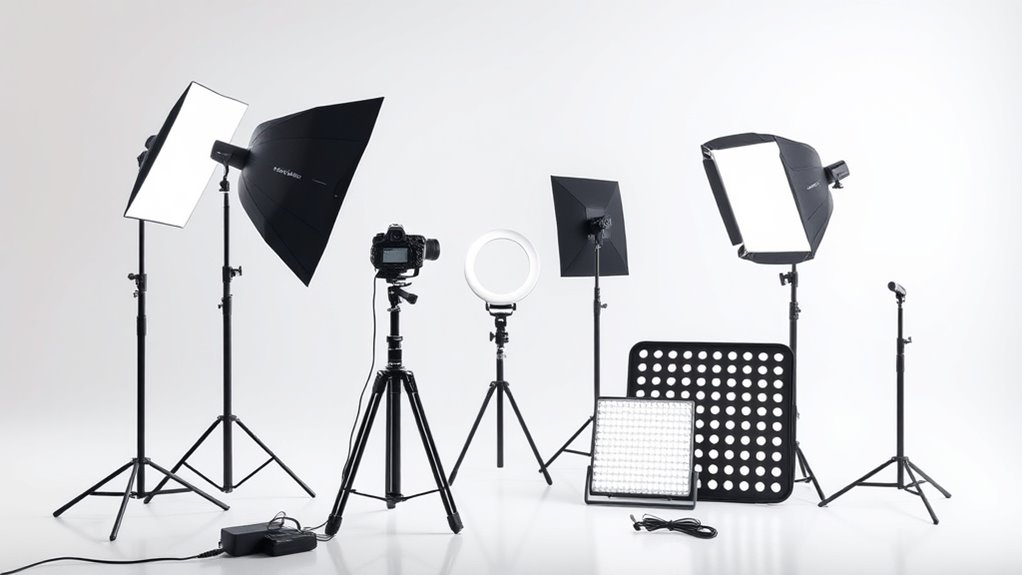 If you’re looking to upgrade your videos and photos, I recommend exploring some of the top studio lighting kits designed for content creators. Options like LED panels with adjustable brightness and color temperature, softbox systems for smooth lighting, and portable ring lights can make a huge difference in quality. Many kits also include tripods, remote controls, and accessories for versatile setups. Keep reading to discover which lighting solutions best match your needs and budget.