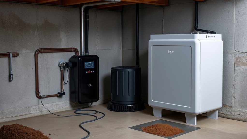 When selecting a sump pump backup, I consider how much power I need to handle my sump’s flow and the compatibility with my existing system. I also look at backup run time, safety features, and whether the system offers monitoring or alerts to keep me informed. These factors help guarantee I choose a reliable backup that protects my basement effectively.