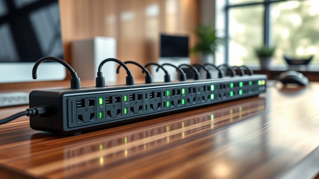When I connect multiple devices to a surge protector, I rely on its design to handle the load safely. Good surge protectors distribute power evenly and have overload protection to prevent overheating. I always check the total wattage capacity and individual outlet limits. By doing so, I guarantee my devices stay safe, and I avoid tripping the breaker or damaging my electronics. Properly rated protectors make managing multiple devices simple and secure.