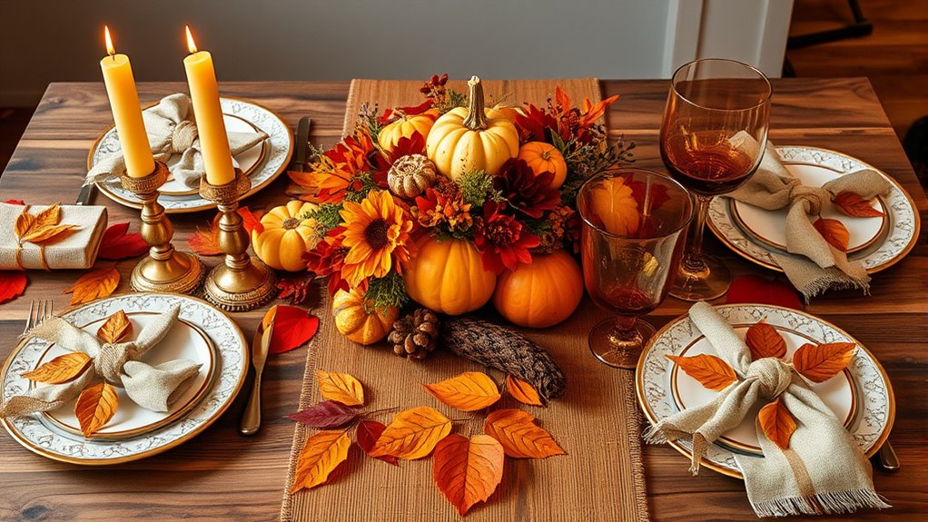 Ever wonder how to make your Thanksgiving table truly festive and cohesive? The key is choosing a table runner that matches your seasonal and thematic decor. Focus on colors like warm terracotta, burnt orange, or autumn leaves to evoke fall’s cozy spirit. Pick a pattern that aligns with your overall style—rustic, bohemian, farmhouse, or elegant—to create harmony. Make certain motifs like pumpkins, maple leaves, or harvest symbols complement your centerpieces and seasonal decorations. Additionally, consider the runner’s size to ensure it fits your table comfortably and enhances the visual balance. Finally, choose materials and colors that blend seamlessly with other decor elements, strengthening the festive atmosphere and making your Thanksgiving table look thoughtfully curated.