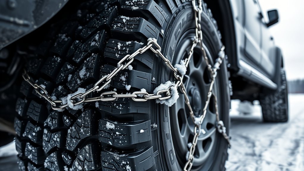 Choosing the right tire chains for your SUV or truck starts with making sure they fit your vehicle’s specific requirements. First, check your owner’s manual or the tire sidewall for the correct tire size; this info is vital. Next, select chains designed for your vehicle type, since SUVs and trucks often have different clearance needs and spacing. It’s also essential to verify that the chains meet safety standards and won’t interfere with your vehicle’s components. Consider your vehicle’s weight and axle load capacity to guarantee the chains can handle the demands of heavier trucks or off-road SUVs. Lastly, match the chains to your driving conditions—heavy-duty or off-road terrain calls for more robust chains. Proper fit ensures safety, performance, and prevents damage during tough weather.