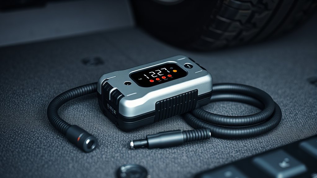 Choosing a tire inflator that matches your vehicle’s power source is essential for safe and efficient use. Most inflators connect to a 12V DC cigarette lighter socket or directly to the vehicle’s battery. It’s important to check the maximum power rating (watts) to guarantee it won’t overload your vehicle’s electrical system. Also, verify that the plug type and connector fit your power outlet properly to avoid compatibility issues. Some models support dual power options, like both 12V DC and 110V AC, offering versatility for different situations. Additionally, consider the length of the power cord to ensure it can reach all tires comfortably without needing an extension. Proper power compatibility guarantees safe operation and reliable inflation every time.