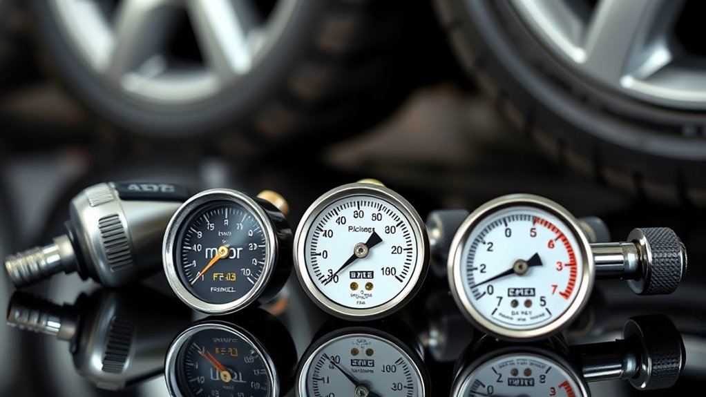 If you want to keep your wheels in top shape, I recommend checking out the 15 best tire pressure gauges. These include analog, digital, and heavy-duty options that guarantee accurate readings and durability. Some come with inflators, auto shutoff, and easy-to-read displays, making tire maintenance quick and simple. To find the perfect fit for your needs, you’ll want to take into account features, range, and compatibility. Keep reading, and I’ll help you find the best one for your vehicle.