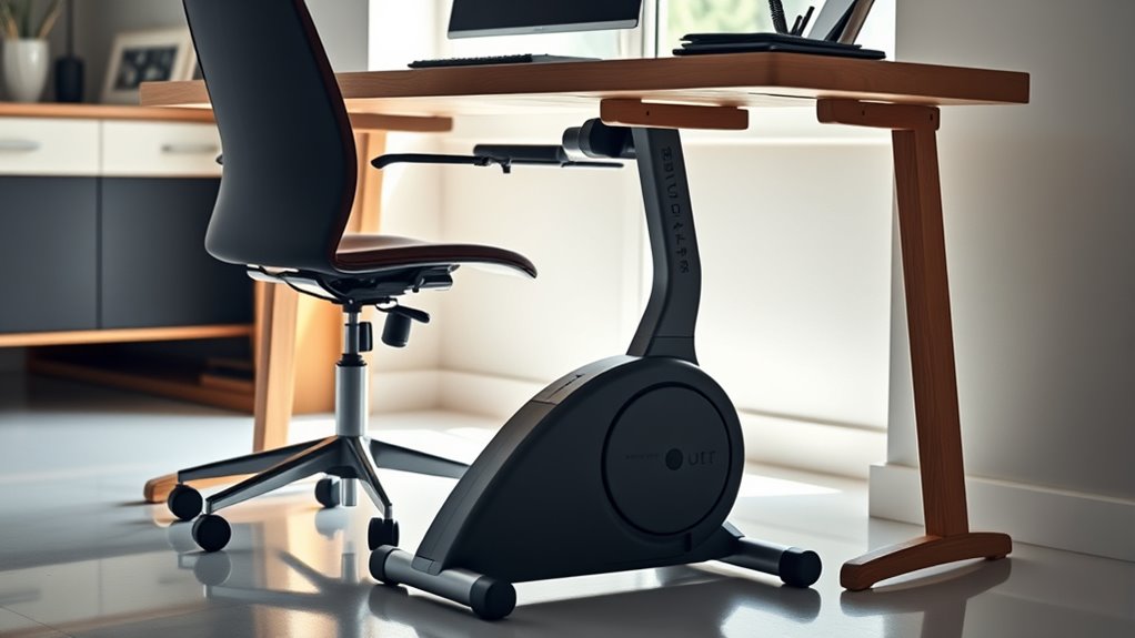 Safety features are essential to guarantee that your under-desk elliptical provides a secure and comfortable workout. Non-slip pedals and mats prevent slips and falls, giving you stability during exercise. Smooth, controlled pedal motion reduces the risk of joint strain or injury, ensuring a gentle yet effective workout. Auto-stop or automatic shut-off mechanisms add an extra layer of safety by preventing overheating or overuse. Adjustable resistance levels let you customize intensity, helping to avoid muscle strain or overexertion. Clear, accessible controls like remote controls or easy-to-read displays allow you to operate the elliptical safely without distractions. Prioritizing these safety features ensures your workout remains effective and risk-free, so you can focus on your fitness goals with confidence.