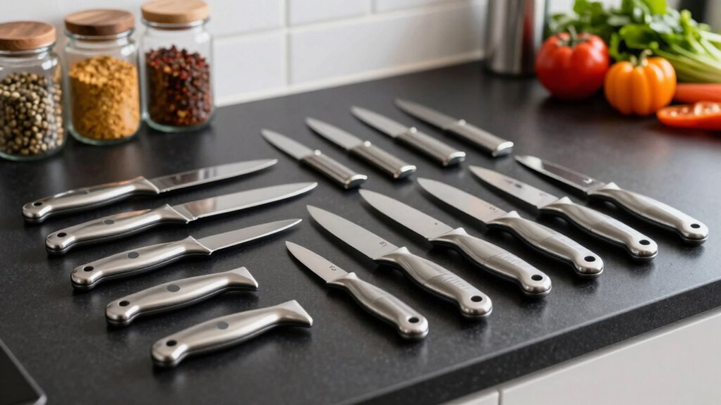 Choosing the right utility knife depends on how well it fits your specific kitchen tasks. I recommend selecting a blade between 4 and 6 inches, as this size offers versatility for slicing fruits, vegetables, and meats. A sharp, fine edge with a 13° or 15° bevel guarantees precise cuts and clean results. Look for a design that balances flexibility with rigidity, which allows detailed work without sacrificing strength. High-quality materials like high-carbon stainless steel or Japanese VG10 Damascus provide durability and retention of sharpness, even after frequent use. Additionally, a comfortable, non-slip handle is essential for control, especially during intricate or forceful cuts. When your knife matches your tasks, it becomes a reliable tool that enhances your efficiency in the kitchen.