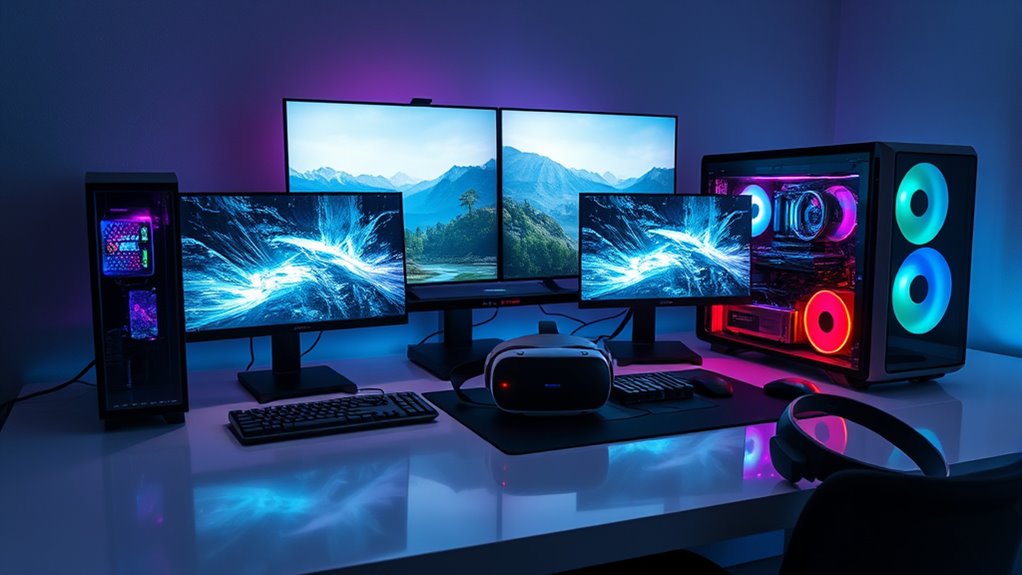A well-designed cooling system not only keeps your VR-ready desk PC running smoothly but also prevents overheating during intense VR sessions. Effective cooling, like liquid coolers or multiple case fans, maintains peak performance and reduces thermal throttling, which can cause lag or crashes. Noise levels are heavily influenced by the quality and design of these cooling components; quieter options, such as high-quality fans or liquid cooling, help create a more comfortable environment. Proper airflow, with well-placed intake and exhaust fans, is essential to dissipate heat from high-performance parts. Striking a balance between cooling efficiency and noise output is key—more aggressive cooling might boost performance but can also increase noise. Prioritizing quiet, effective cooling ensures a smooth, immersive VR experience without unnecessary distractions.