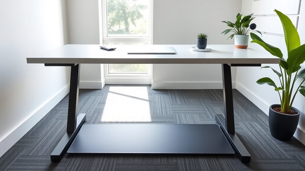When choosing a walking pad for your standing desk, it’s essential to make sure the treadmill’s height adjustment matches your desk’s height range. This ensures smooth integration without the need for constant repositioning. Additionally, verify the treadmill’s width and length fit comfortably under or beside your desk, allowing free movement and ample workspace. Check that the speed settings align with your standing and walking routines to prevent accidental over-speeding. Compatibility between the treadmill’s control system—whether manual or app-based—and your desk setup is also important for easy operation. Ultimately, consider the walking pad’s stability and weight capacity to support your adjusted desk height safely. Proper compatibility guarantees a seamless, comfortable, and productive working environment.