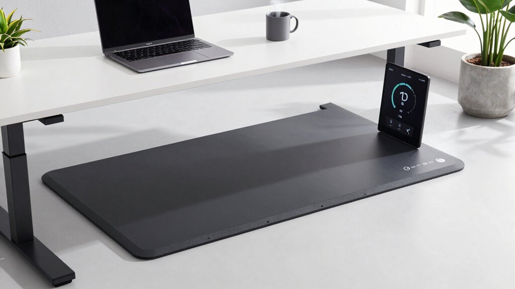 Connectivity and control features play a crucial role in making your under-desk walking pad both user-friendly and seamlessly integrated into your work routine. Bluetooth and app integration let you track your activity in real-time and customize workout programs to suit your goals. Remote controls allow quick adjustments to speed, incline, and settings without interrupting your focus. Compatibility with fitness apps enhances the experience by offering virtual routes, training plans, and progress tracking, motivating you to stay active. Wireless connectivity reduces clutter and makes it easier to operate the treadmill during work. Built-in speakers and Bluetooth support enable you to listen to music or audio cues, boosting motivation and engagement. These features guarantee your walking pad complements your workflow while keeping you connected and in control.