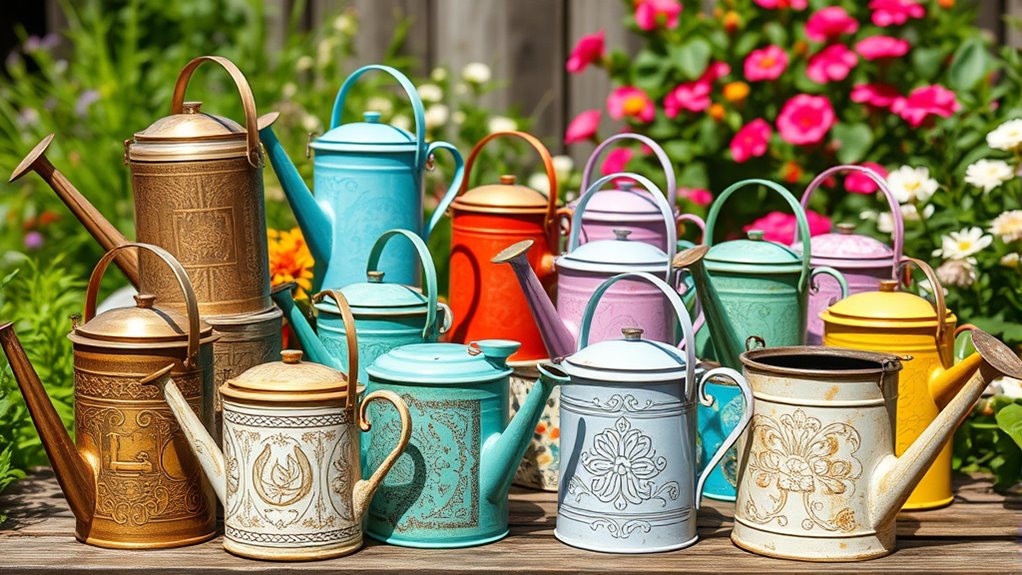 If you’re looking to elevate your garden style, I recommend exploring a variety of decorative watering cans that blend charm with functionality. From vintage galvanized metal pieces to charming bird-shaped or floral motifs, there’s a design for every aesthetic. Smaller mini cans also add cute accents, while larger vintage-looking options make a bold statement. If you’re curious about the best options to beautify your space, you’ll find plenty of inspiring ideas ahead.