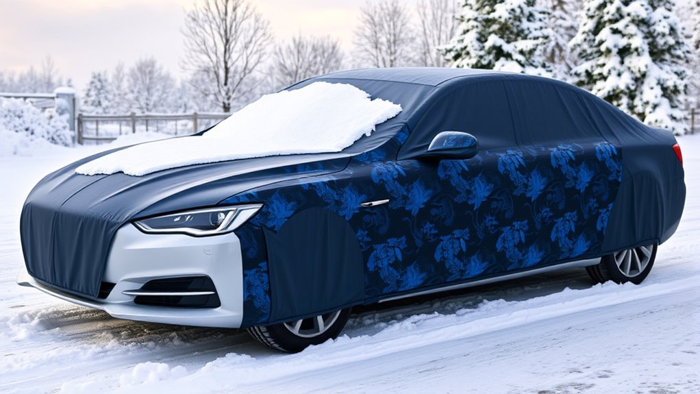 Think of your car as a brave knight; a waterproof snow cover is its shield. Yes, you can use it during heavy rain too. It keeps your vehicle dry, protecting against the rain’s relentless assault just like a shield deflects arrows. I use mine in all weather—snow, rain, or shine—to guarantee my car stays pristine. It’s a versatile barrier, giving peace of mind no matter the storm.