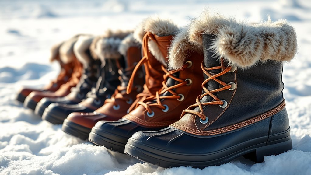 Choosing waterproof snow boots for women begins with inspecting the quality of their waterproof materials. I look for boots with seam-sealed membranes or waterproof layers integrated into the upper fabric, which prevent water from seeping through vulnerable points. Materials like waterproof leather, synthetic Oxford cloth, and polyurethane are popular for their durability and resistance. To ensure lasting protection, I check the waterproof ratings, such as IPX standards, that indicate how well the boots withstand water pressure or immersion. Reinforced areas like leather toe caps and heel counters also boost water resistance and durability. Construction techniques, including sealed seams and waterproof glues, are essential for preventing leaks. Ultimately, high-quality waterproof materials provide the foundation for boots that keep my feet dry and comfortable in snowy conditions.