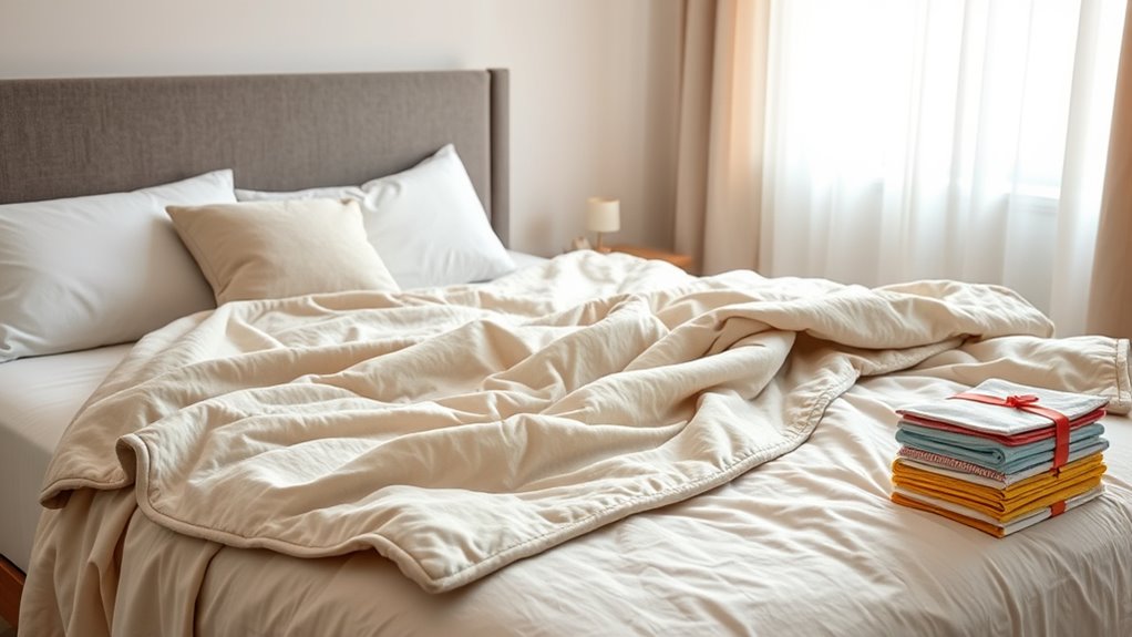 To keep my weighted blanket effective, I follow a few simple maintenance tips. I always check for loose stitching and spot-clean it regularly to prevent dirt buildup. I also avoid washing it too often—once every few months is enough—using gentle cycles and mild detergent. I store it in a cool, dry place when not in use. These steps help preserve its weight and guarantee it stays cozy and effective.