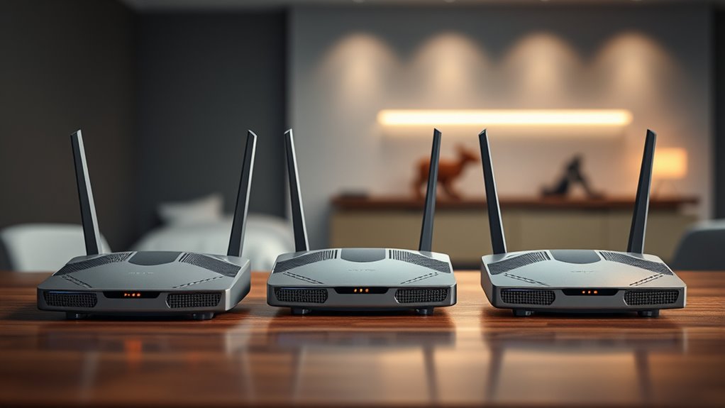 Firmware updates considerably boost my router’s longevity and security. They fix bugs, patch vulnerabilities, and improve performance, ensuring I stay protected from new threats. I make it a point to regularly check for updates and install them promptly. This proactive approach keeps my network stable, speeds up connection issues, and extends the life of my device, so I don’t have to replace my router as often.