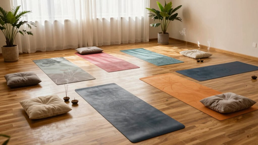 When choosing a yoga mat set for a mindfulness room, I focus on material comfort and safety to guarantee a calming practice. I also consider cushioning, support, and the non-slip surface to prevent slips and enhance stability. Finally, I think about size, design, and how well the set fits the room’s aesthetic and portability needs.