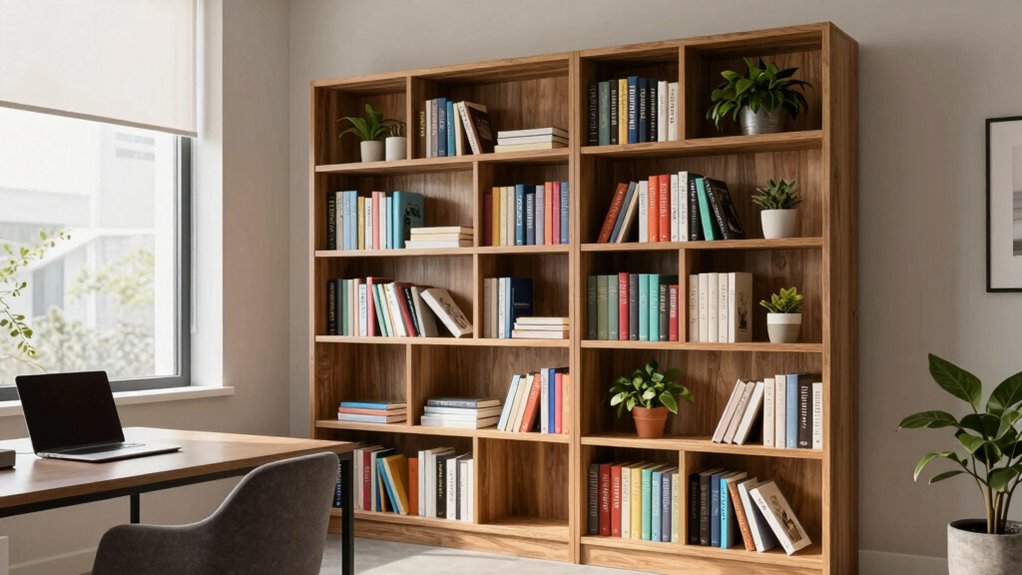 Have you ever considered how a simple bookshelf can transform your workspace into a more productive environment? It’s not just about storing books; it’s about shaping your office decor to inspire focus and efficiency. A well-chosen bookshelf adds character to your space, making it feel organized and welcoming. When your office decor reflects order and purpose, you’re more likely to stay motivated and engaged throughout the day. Plus, a good bookshelf isn’t just aesthetic—it’s functional, helping you keep essential materials within arm’s reach, reducing clutter and distractions.