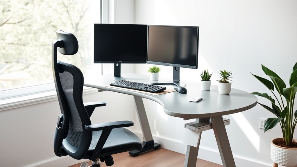 While an adjustable chair is a crucial component of ergonomic setup, relying on it alone isn’t enough to prevent discomfort or injury. Your office aesthetics and desk material also impact comfort and posture. A well-chosen chair supports your back, but proper positioning and workspace arrangement matter equally. Consider how your desk’s surface and material influence your ergonomics, as a smooth, stable surface reduces strain.