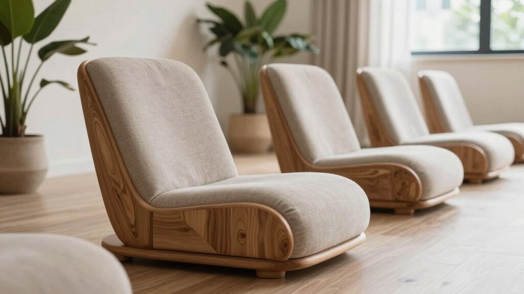 Think of meditation chairs as gentle landscapes for your practice. The best materials, like eco-friendly options, blend durability with comfort, supporting your posture effortlessly. Prioritize ergonomic design, which acts as a guiding hand, ensuring your spine stays aligned while you meditate. Bamboo, recycled wood, and natural fibers not only nurture your body but also respect the environment, creating a harmonious space for mindfulness.
