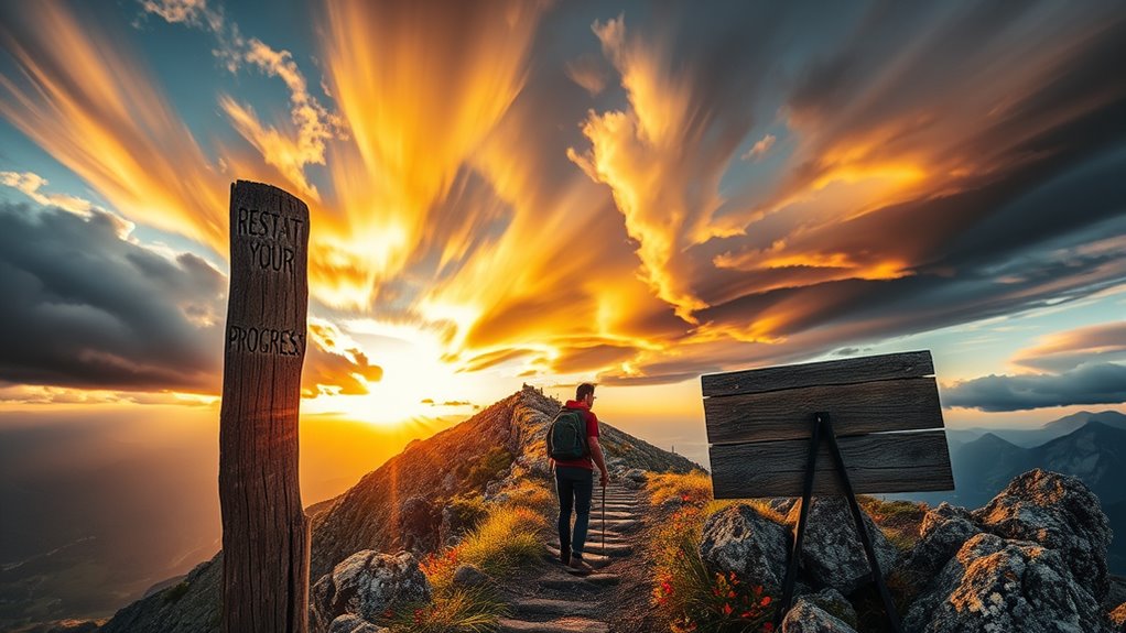 When you hit a plateau, it’s a sign your body’s adapted to your routine. To restart progress, try adding variety to your workouts by varying exercises and increasing intensity. Adjust your nutrition by reducing processed foods and boosting lean proteins and healthy fats. Shift your mindset to view setbacks as growth opportunities, stay consistent, and practice patience. Keep exploring different strategies to move past stagnation—you’re about to learn even more ways to break through.