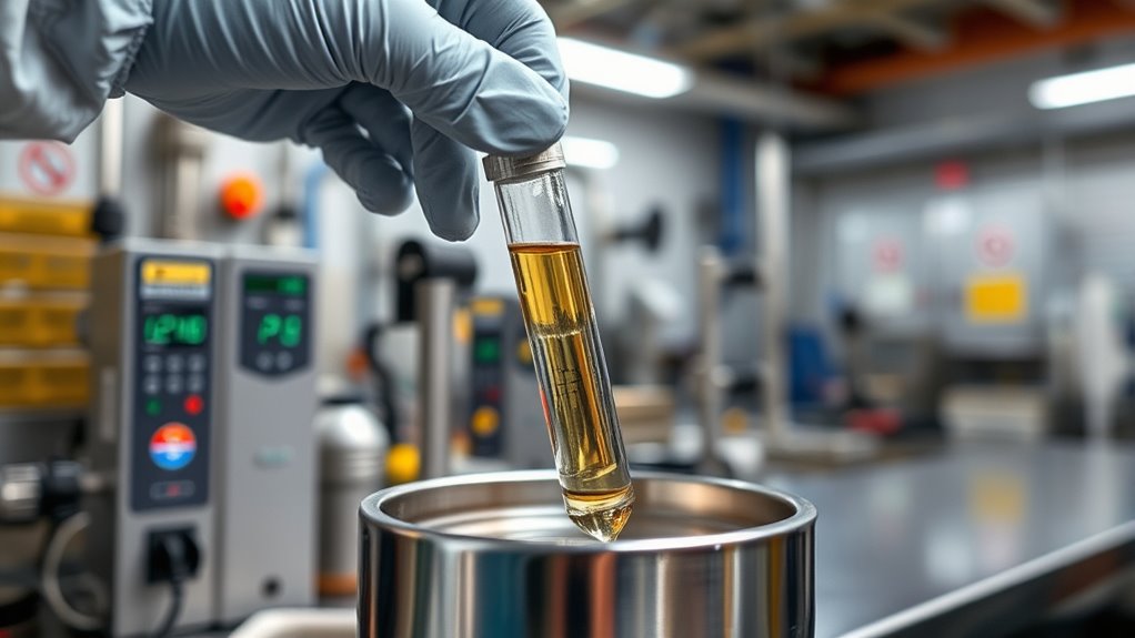 Selecting the right testing methods and equipment is essential for reliable oil quality assessments. You should follow proper sampling protocols to guarantee the samples accurately reflect the oil’s condition. Key testing equipment includes viscometers, spectrometers, and flash point testers, which measure viscosity, contamination levels, and flammability, respectively. Using accurate and calibrated devices is imperative to avoid false readings. Portable testing kits allow quick onsite analysis, while laboratory instruments provide more detailed insights. Always verify that your equipment is maintained and calibrated regularly for consistent results. Employing the correct testing methods paired with appropriate equipment ensures you detect issues early, maintain safety standards, and prolong equipment life. Proper testing forms the foundation for effective oil management and safety compliance. Additionally, understanding common testing issues can help prevent misdiagnosis and ensure accurate results.