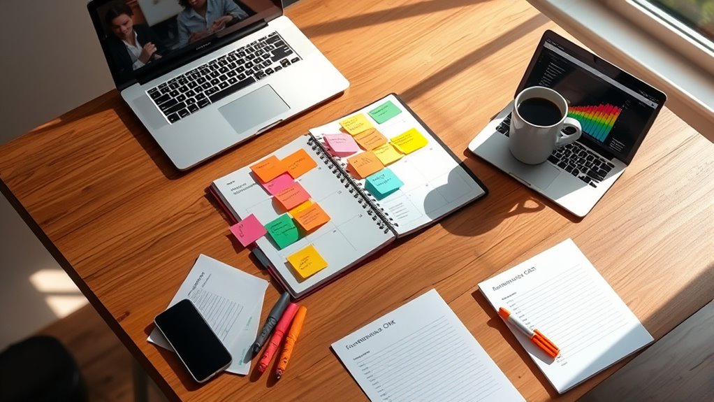 Celebrating small wins keeps your team motivated and reinforces progress toward larger goals. When you acknowledge even minor achievements, you boost confidence and create a sense of momentum. These celebrations remind everyone that their efforts matter and bring you closer to your objectives. To maintain this momentum, set up regular check-ins to recognize progress and share success stories. Keep celebrations meaningful and specific—highlight what was achieved and how it contributes to overall goals. This practice cultivates a positive environment where persistence is valued. By focusing on small wins, you prevent burnout and keep motivation high. Remember, sustained progress relies on continuous acknowledgment and encouragement, ensuring your team stays engaged and committed to turning big visions into daily realities.